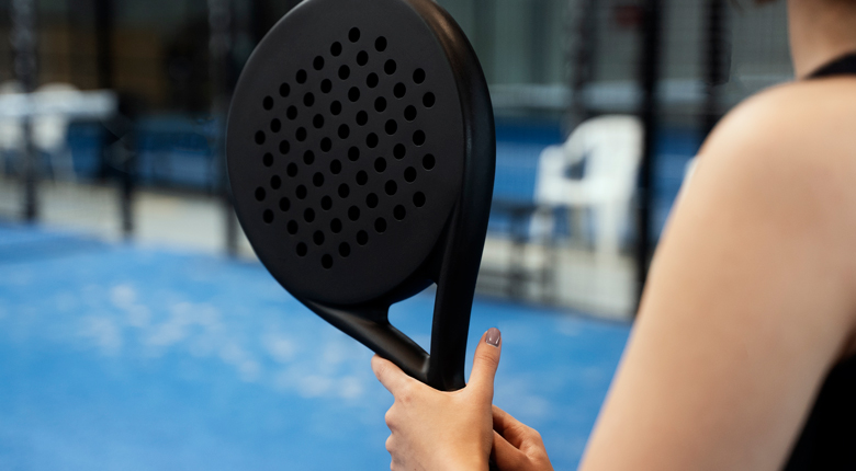 Raket padel berbentuk solid, lebih kecil, tanpa senar, dan memiliki lubang-lubang kecil untuk mengurangi hambatan udara. Desain ini membuat pukulan lebih mudah dikendalikan.