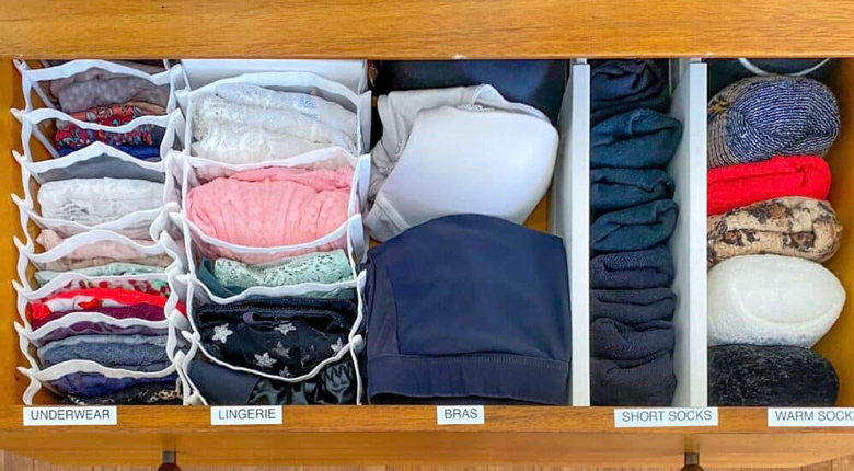 Organizer atau sekat laci sangat membantu dalam menyimpan pakaian dalam. Setiap item memiliki tempatnya sendiri sehingga tidak saling bertumpuk.