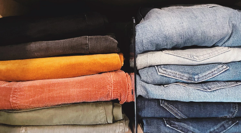 Celana jeans dan celana kasual lebih efisien jika dilipat dan disimpan di rak. Cara ini menghemat ruang dibandingkan menggantung. Pastikan juga ukuran celana saat dilipat sama semua.